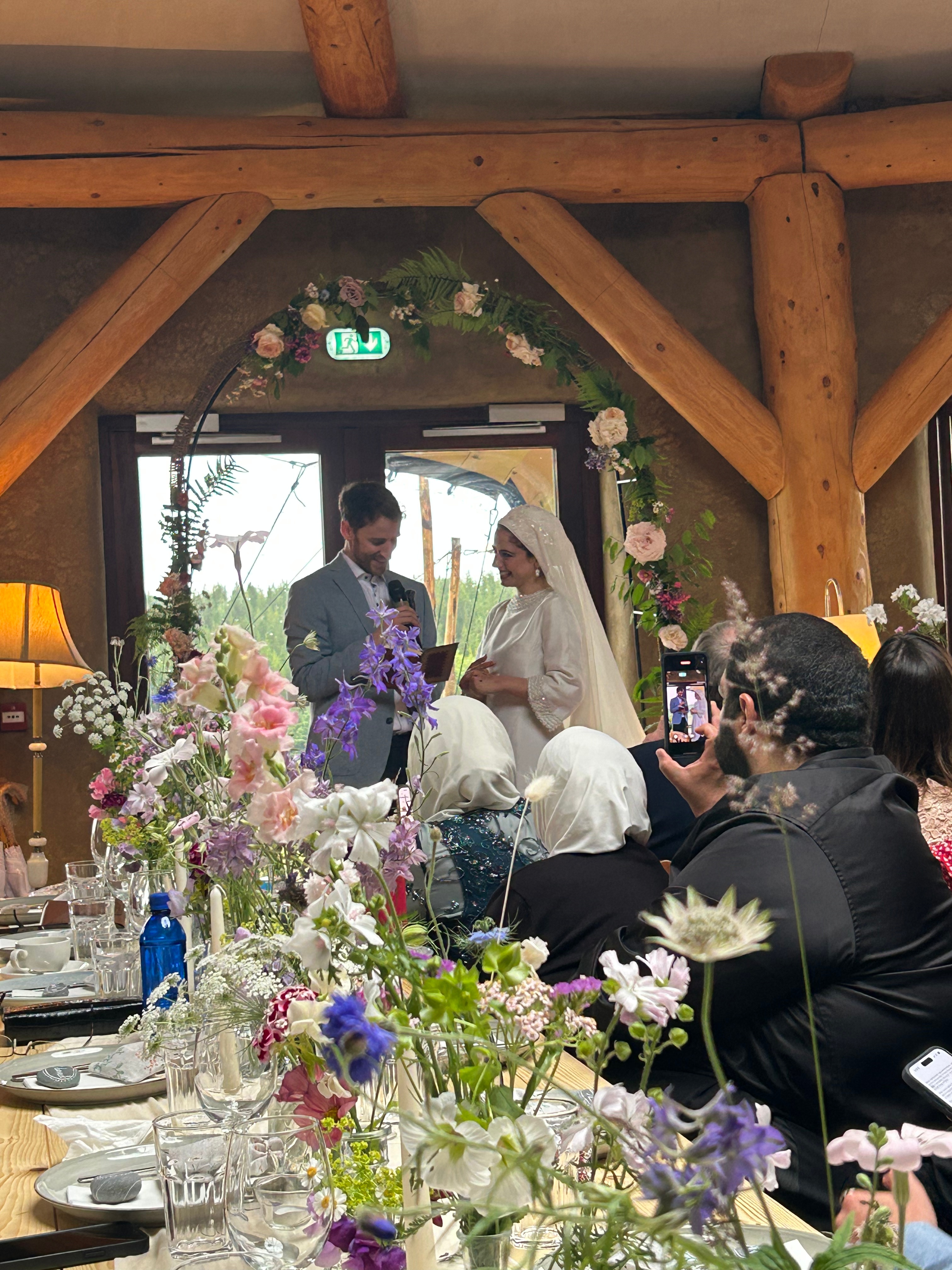 The wedding took place right there in the communal lodge space with panoramic views of the water.